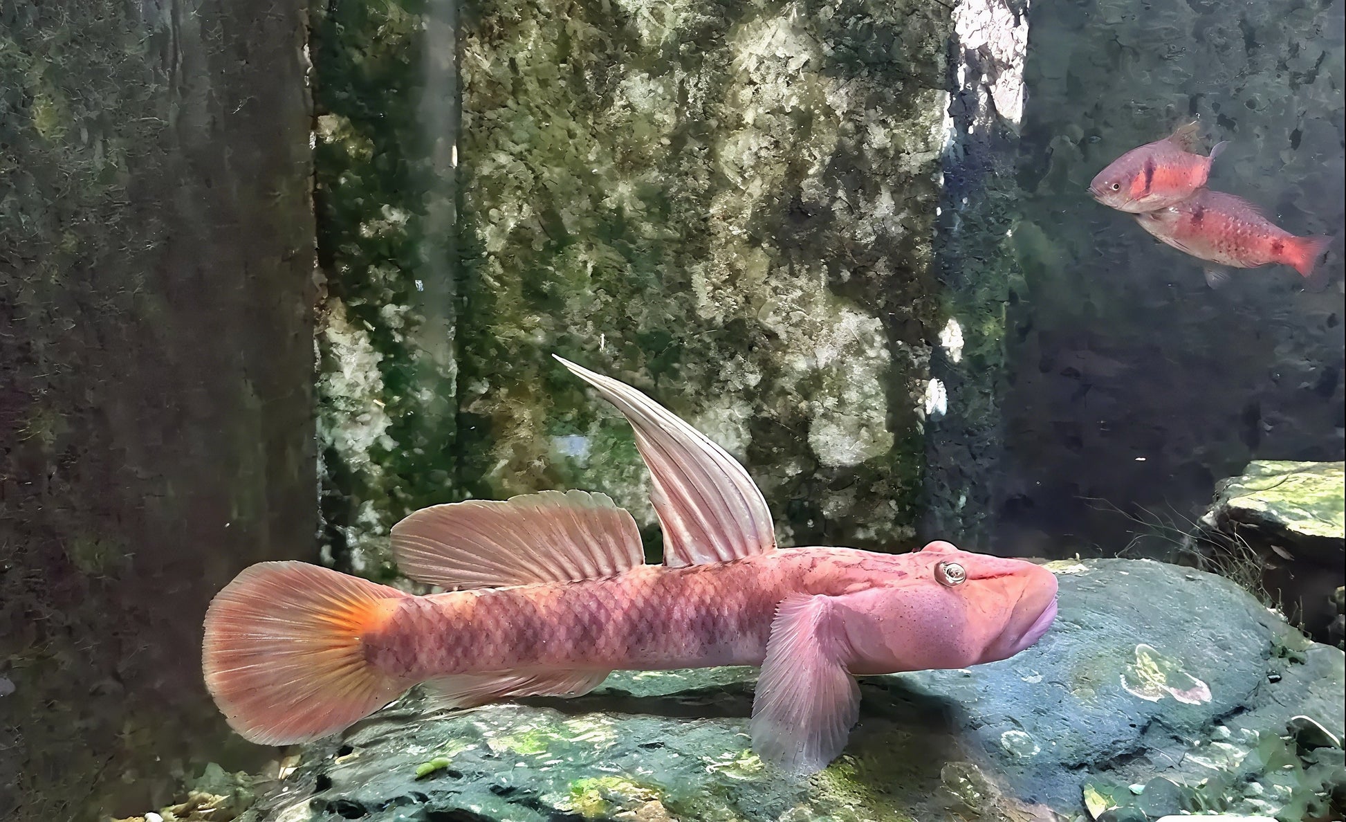 The Amur Goby is a graceful and robust Freshwater Goby native to East Asia—spanning rivers from Japan and Korea to Taiwan and China. Reaching nearly 4 cm, its distinctive features include a slender brown body often bearing vertical bands, an eye-stripe from the snout, and a bright orange patch at the base of the tail. Males display ornate patterns: red-barred dorsal fins, wavy orange tail stripes, and scattered orange-red spots on the cheeks—creating a visually complex and engaging appearance perfect for any Biotope & Native Fish setup.