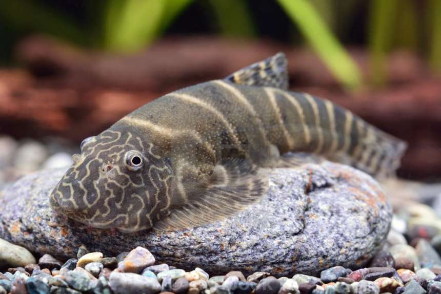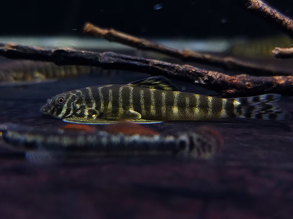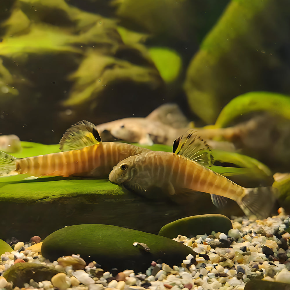 Setup suggestions: Strong water flow with high oxygenation, smooth rocks for grazing, fine substrate, and hiding spots. Dim to moderate lighting encourages algae growth for natural feeding.