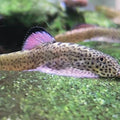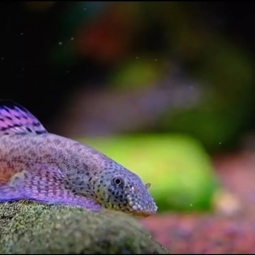 The Purple Fin Loach (Pseudogastromyzon laticeps) is a compact hillstream loach from the fast‑flowing streams of Guangdong, China. Reaching up to 6 cm, it is admired for its striking purple fins which contrast beautifully with its algae‑grazing body. A social and peaceful bottom dweller, it is an ideal choice for a specialized river-style aquarium, adding a splash of rare and beautiful color.